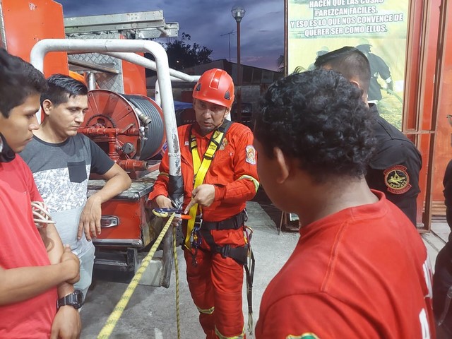 El fin de semana último, en la sala de instrucción de la Unidad Básica Operativa de la Compañía de Bomberos Voluntarios – San Juan 93, ubicada en el distrito de San Juan Bautista, en la ciudad de Iquitos – Loreto, el teniente CGBP Norberto Rodríguez Vásquez, especialista en gestión de riesgo y rescatista internacional certificado, loretano de nacimiento, volcó sus conocimientos teóricos – prácticos al dictar los cursos intensivos de “Prevención de incendios por riesgo eléctrico” y “Lote de cuerda para rescate” dirigido a jóvenes bomberos, personal PNP de rescate e invitados.