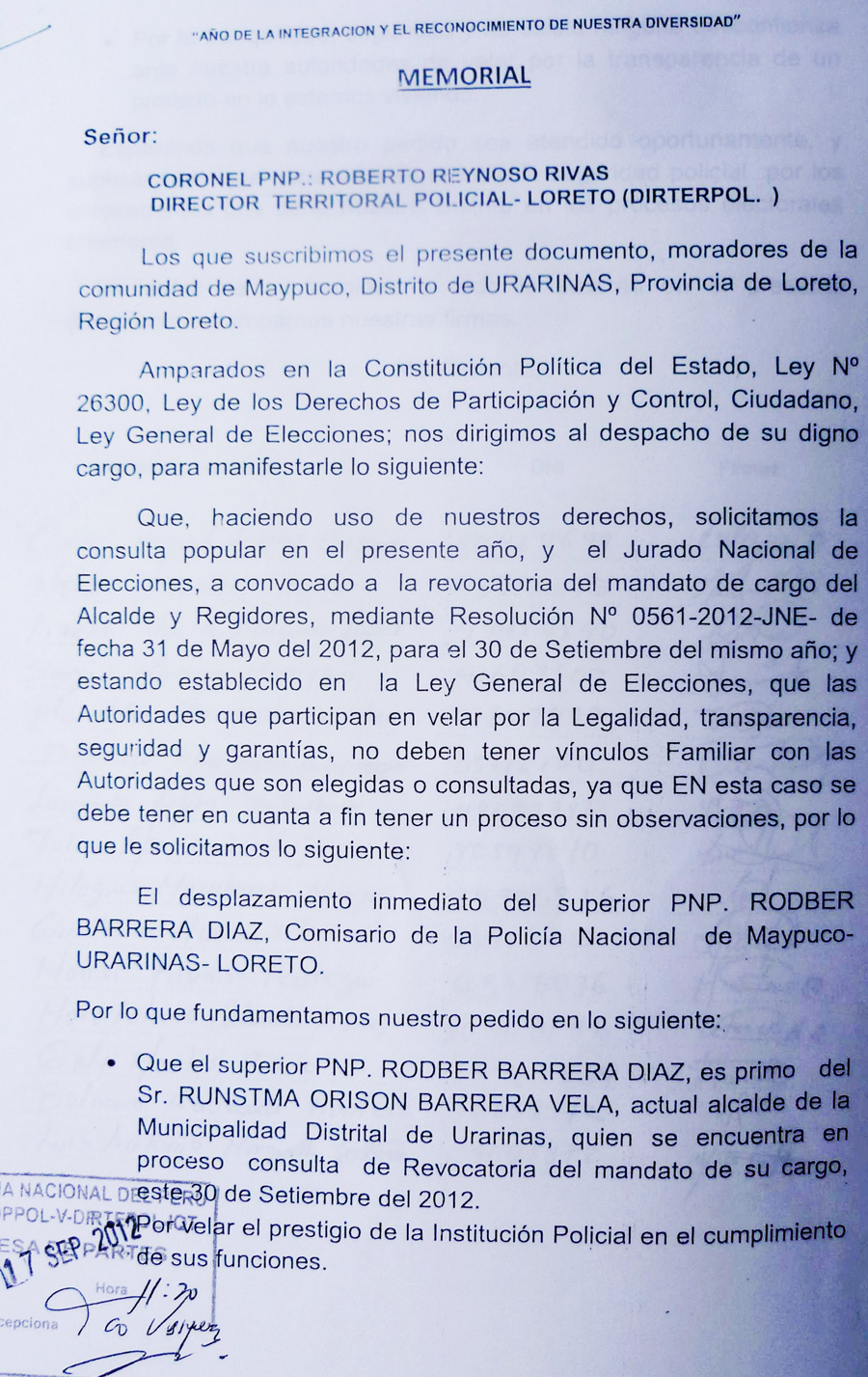 Pobladores de la localidad de Maypuco – río Marañón, comprensión de la jurisdicción del distrito de Urarinas, en la mañana de ayer lunes 17 del presente, a horas 11.20 aproximadamente, mediante memorial que lleva la firma de más de un centenar de adherentes, han solicitado al comando de la V-DIRTEPOL – Loreto, que despacha el coronel PNP Roberto Reynoso Rivas y así como también, al director de la Región Policial Oriente, en la persona del general PNP José Céspedes Aguirre, el desplazamiento inmediato del sub oficial superior PNP Rodber BARRERA DIAZ, por ser el primo del alcalde de la municipalidad distrital de Urarinas, Runstma Orison BARRERA VELA, quien se encuentra en proceso de consulta de revocatoria del mandato de su cargo, programado por el Jurado Nacional de Elecciones para este 30 de Setiembre del año 2012.