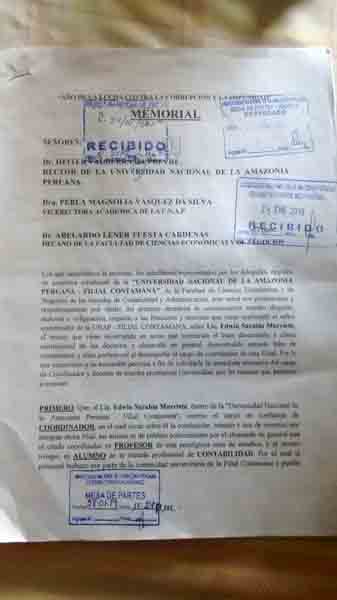 El memorial le enviamos al rector Heiter Valderrama, a la vicerrectora académica Perla Vásquez, con cinco puntos bien fundamentados, con pruebas de todas las falencias. Él dispuso llamar al decano de la facultad y a la coordinadora de filiales. Entramos y el rector dijo que está conforme con él porque ha trabajado el licenciamiento y eso es falso, quienes hemos trabajado hemos sido los alumnos.