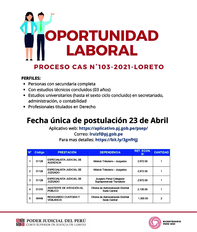 Para hacerlo, sólo debe contar con una computadora con acceso a Internet, e ingresar a la página web del Poder Judicial, sección “Oportunidad Laboral”, la cual le redireccionará a la ventana “Postulación, Selección, y Evaluación de Personal”; dé click a la opción “CAS”; seguidamente, vaya al campo “seleccione concurso”, el cual desplegará las convocatorias a nivel nacional, debiendo elegir la opción PROCESO CAS N° 103-2021 LORETO (LORETO); desde la cual podrá descargar: detalles del proceso de selección, bases, y cronograma del concurso.
