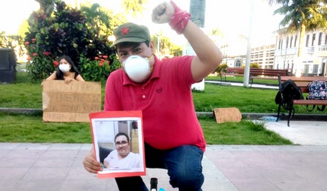 En el lugar también se encontraba el Dr. Enrique Sicchar, médico del Hospital Regional de Loreto, quién junto a las demás personas mostró su indignación, por todos sus colegas caídos, entre ellos el anestesista, Dr. Héctor Herbozo Olortegui.