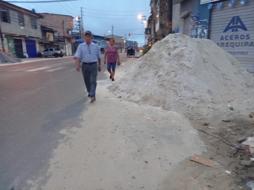 De acuerdo con los vecinos, el material de construcción es arena, ladrillos, cemento y otros, que usan parte de la vereda peatonal, lo que obliga a los peatones a pasar por la pista para continuar su recorrido por la avenida Augusto Freyre.