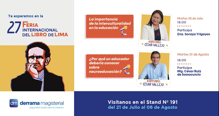 Asimismo, Derrama Magisterial tendrá a su cargo dos conferencias del rubro educativo. La primera, “La importancia de la interculturalidad en la educación”, será desarrollada por la Dra. Soraya Yrigoyen el martes 25 de julio a las 6:00 p.m. en el auditorio César Vallejo. La segunda conferencia titulada “¿Por qué un educador debería conocer sobre neurociencia?”, estará a cargo del magíster César Ruiz de Somocurcio, y se llevará a cabo el martes 01 de agosto a las 6:00 p.m, en el auditorio César Vallejo.