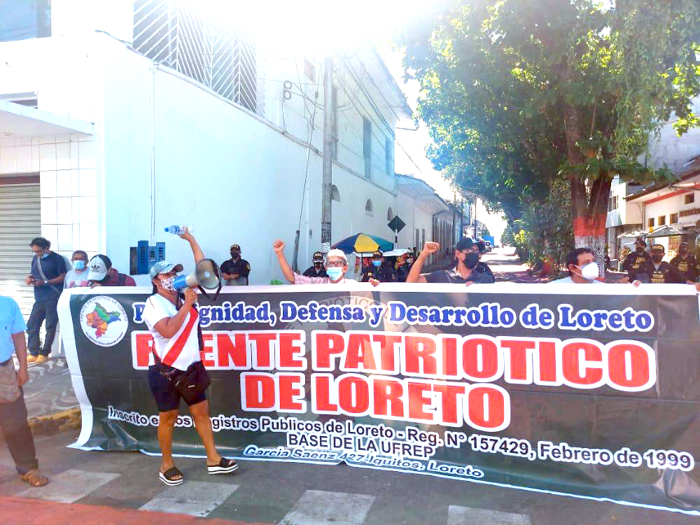 El Frente Patriótico de Loreto y el Comité de Defensa del Agua protestaron la mañana de ayer, 11 de octubre, cerca de la IV Macro Región Policial Loreto, como respaldo a la medida de lucha de los pobladores del distrito de Alto Nanay contra minería ilegal que se lleva a cabo a lo largo de las cuencas del río Nanay.