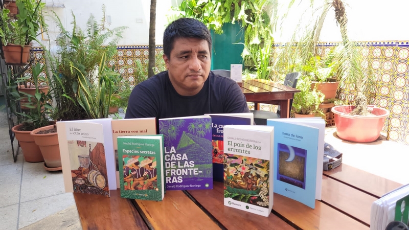 Gerald Rodríguez Noriega ya lleva publicados los poemarios “La tierra con mal” (2012) “El libro del otro reino” (2017) los cuentos “Llena de luna (2014) “Especies secretas” (2021), las novelas “La casa de las fronteras” (2019) y “El país de los errantes” (2022). En enero próximo publicará el poemario “Todos en el polvo” y el ensayo “El sentir del fuego”. Estos últimos serán presentados en enero del 2023 como parte de las celebraciones de Tierra Nueva por el aniversario de Iquitos.