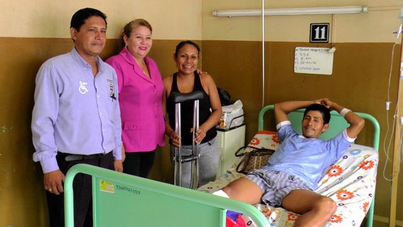 La entrega de las muletas se realizó ayer en el Hospital Apoyo de Iquitos, donde se encuentra Vásquez, y fue la primera regidora Amanda Sevillano quien le entregó en representación del alcalde Sanjurjo, a través de la OMAPED San Juan.