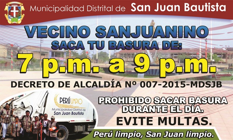 De esta manera se trabaja para mantener el distrito de San Juan limpio y ordenado; por lo mismo, se emitió el Decreto de Alcaldía N° 007-2015 que aprueba y establece el horario para el servicio de recolección de los residuos sólidos, el cual es nocturno, siendo entre las 7:00 y 9:00 pm. las horas en que los vecinos deben sacar su basura a la espera del camión recolector.