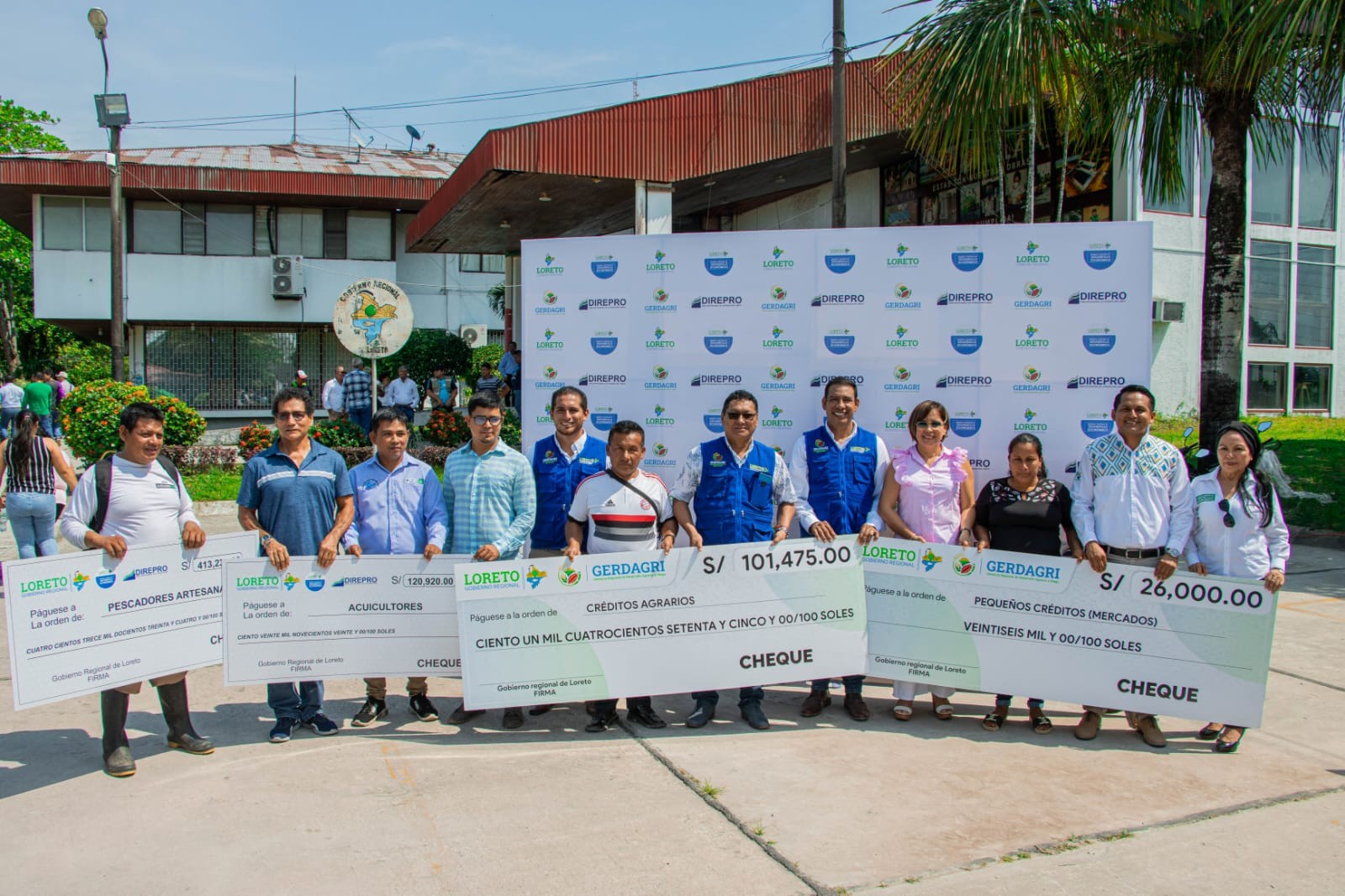 En ceremonia realizada en la explanada principal del gobierno regional de Loreto, presidida por el gobernador Lic. Elisbán Ochoa Sosa, se hizo entrega simbólica de cheques del Programa de Créditos, a productores de los rubros agrario, acuícola y pesquero, así como microcréditos en apoyo a los vendedores de los principales mercados de la provincia de Maynas.