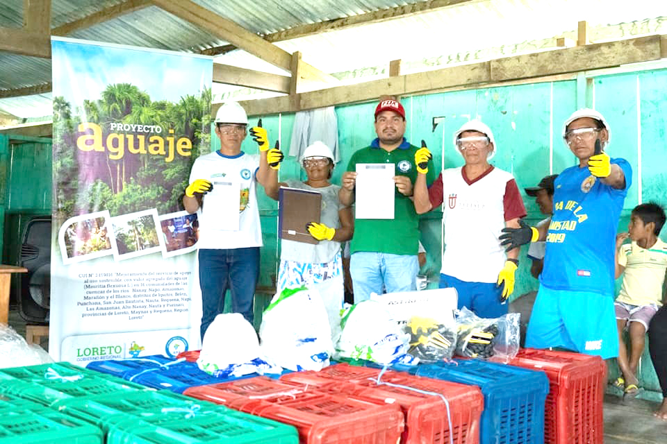 Con el compromiso de seguir mejorando la calidad de vida de más familias loretanas, el proyecto aguaje realizó la entrega de materiales y equipos utilizados para la cosecha del fruto de aguaje (botas, guantes de seguridad, cascos, lentes, machetes y jabas) a las asociaciones comunales de productores y comercializadores del aguaje.