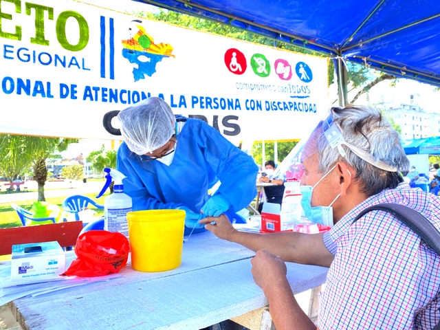 Esta mañana, en la plaza 28 de julio, se llevó a cabo la campaña de descarte de COVID-19 dirigida a 100 personas con discapacidad motora, audio lenguaje, visual, down, entre otras, realizada por el gobierno regional de Loreto, a través de la oficina regional de apoyo a la persona con discapacidad/OREDIS