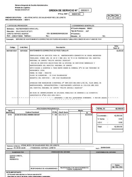 Existe la orden de servicio 0000611, cuyo proveedor es Multiservicios Vara Eirl. Para mantenimiento correctivo del pozo tubular. Le sigue Multiservicios Jsa Eirl. Para instalación de Equipo Clorador. Pero entre paréntesis dice “no incluye equipo”. ¿Cómo es eso? Otro, proveedor Fay Clean Service Gyl Sac, para servicio de limpieza y desinfección de reservorios. Todo a un costo de varios miles de soles.