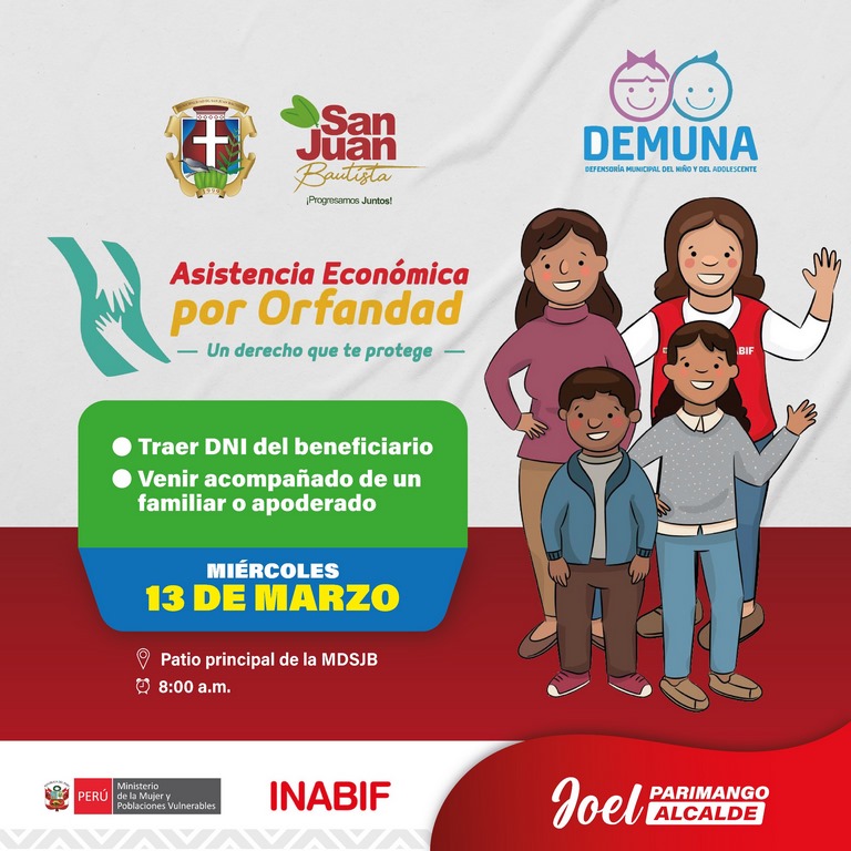 Con el objetivo de paliar las dificultades que enfrentan los menores de edad que han perdido a sus padres o tutores al proporcionar un sustento que contribuya a su manutención, educación y salud, hoy 13 de marzo desde las 8:00 a.m., en el patio principal de la Municipalidad Distrital de San Juan Bautista en coordinación con el INABIF – Ministerio de la Mujer y Poblaciones Vulnerables – MIMP llevarán a cabo la Asistencia Económica por Orfandad.