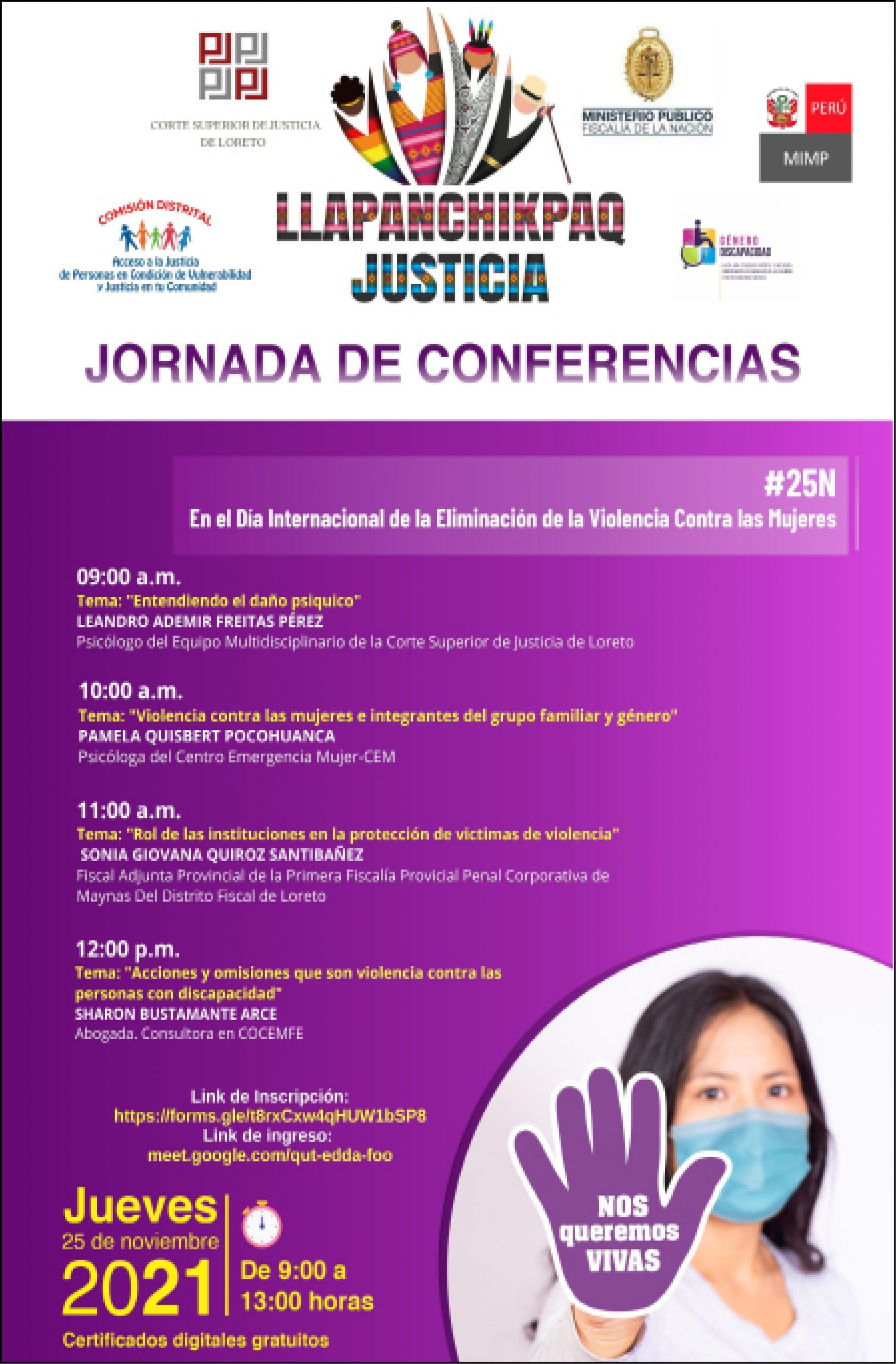 En una iniciativa que busca sensibilizar y educar a la ciudadanía en el tema de Violencia y Derechos, la Corte Superior de Justicia de Loreto, en alianza con instituciones que trabajan en la promoción de derechos, ofrecerá hoy un importante ciclo de conferencias, en el marco del Día Internacional de la Eliminación de la Violencia Contra las Mujeres.
