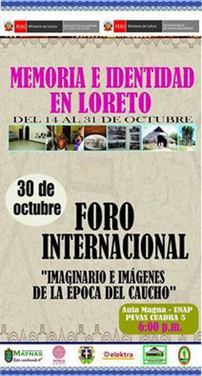 Hoy se desarrolla el Foro internacional denominado «Imaginario e imágenes de la época de caucho» esto en el marco de la semana de «Memoria e identidad de Loreto», en las instalaciones del aula Magna de la UNAP con la participación de poblaciones indígenas así como académicos de Perú como de Colombia.