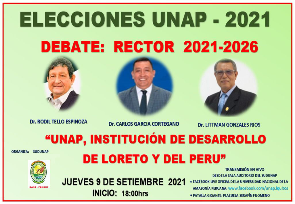 El Sindicato Unitario de Docentes de la Universidad Nacional de la Amazonía Peruana (SUDUNAP), mediante su secretario general Rommel Erwin Quintanilla Huamán, está programando para mañana jueves 9 de septiembre, el desarrollo del primer debate electoral entre los 3 profesionales catedráticos candidatos a rector, con el objetivo que la comunidad universitaria conozca sus perfiles y propuestas.