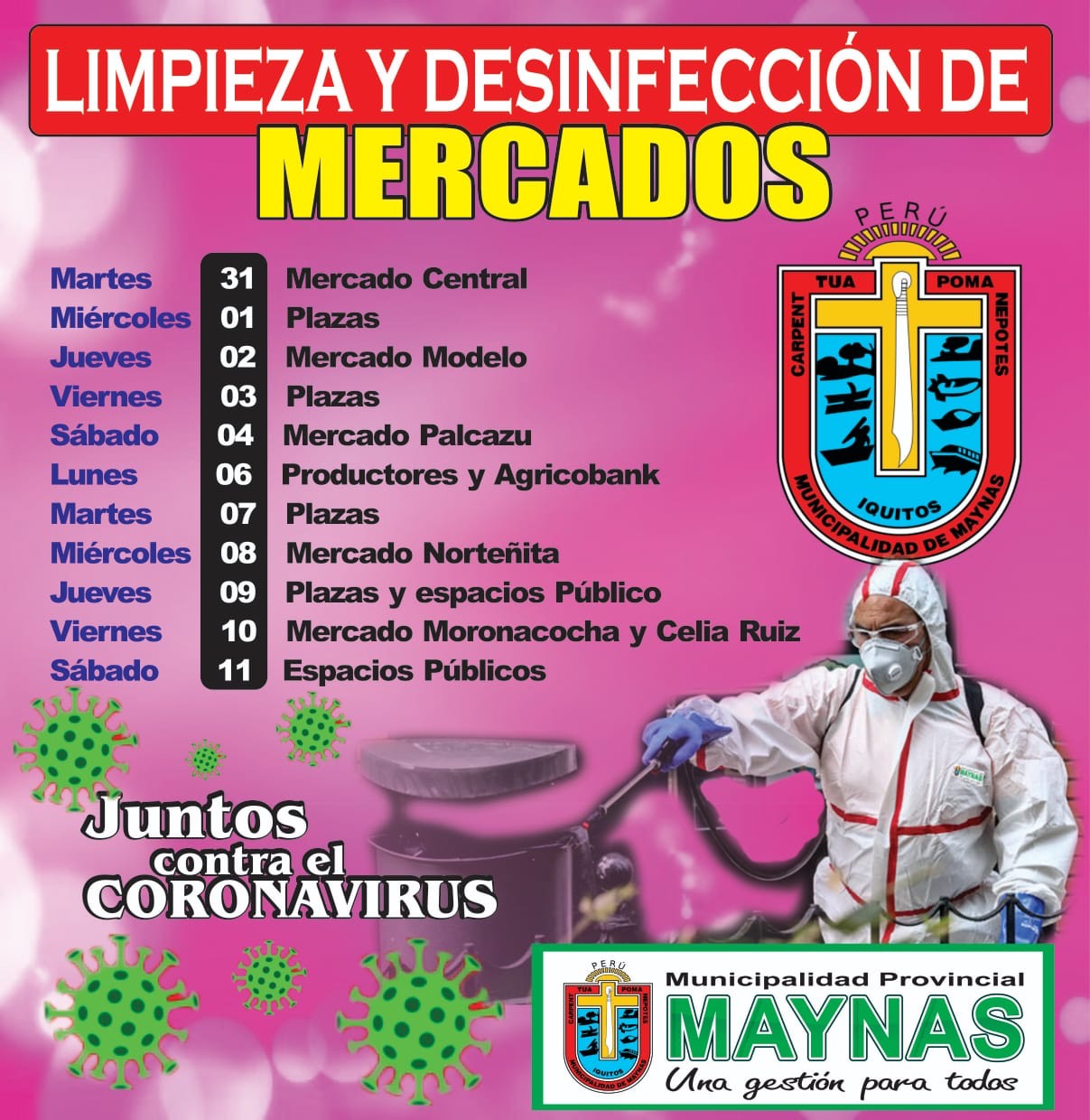 La municipalidad de Maynas, liderada por su alcalde Francisco Sanjurjo, está tomando las acciones pertinentes para combatir la propagación del coronavirus en los mercados y espacios públicos. Para tal efecto, hoy la Gerencia de Saneamiento y Salud Ambiental, conjuntamente con el apoyo de Defensa Civil, División de Comercialización y Serenazgo, comenzarán con esta importante labor, para cuyo efecto han establecido un cronograma de trabajo: