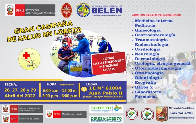 La Presidencia del Consejo de Ministros – PCM, a través del Despacho Viceministerial de Gobernanza Territorial, el Comando Conjunto de Las Fuerzas Armadas, la DIRESA Loreto a través de la Micro red de Salud de Belén y la Municipalidad Distrital de Belén, a través de la Gerencia de Desarrollo Humano e Inclusión Social, realizarán una gran Campaña Cívica Multisectorial en el distrito.