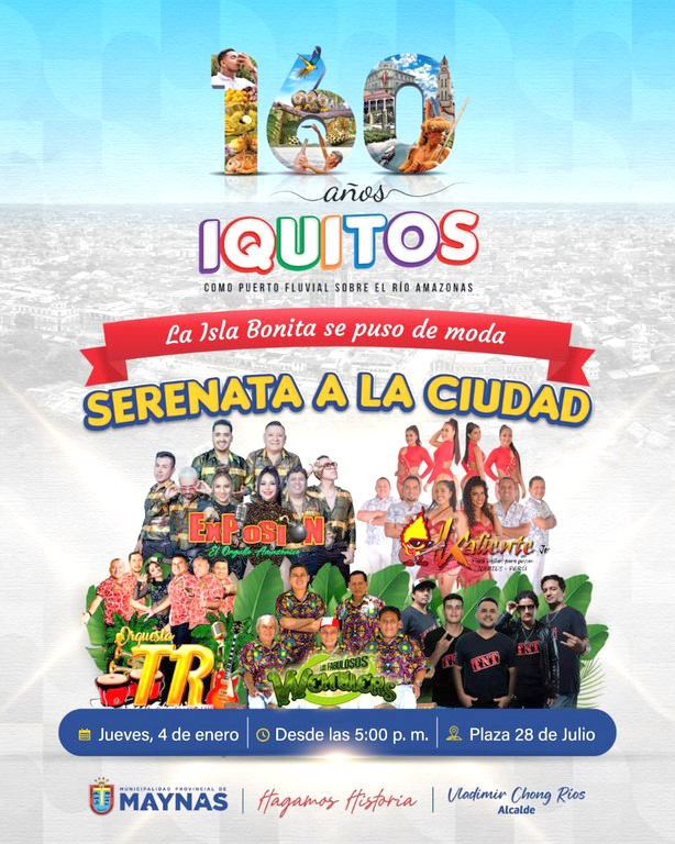 El miércoles 3 de enero de 2024 inició la programación oficial por el 160 aniversario de la ciudad de Iquitos como Puerto Fluvial sobre el Río Amazonas, organizada por la Municipalidad Provincial de Maynas que lidera el Econ. Vladimir Chong Ríos, que viene invitando a toda la comunidad y visitantes nacionales e internacionales, a ser partícipes de esta celebración de la identidad iquiteña.