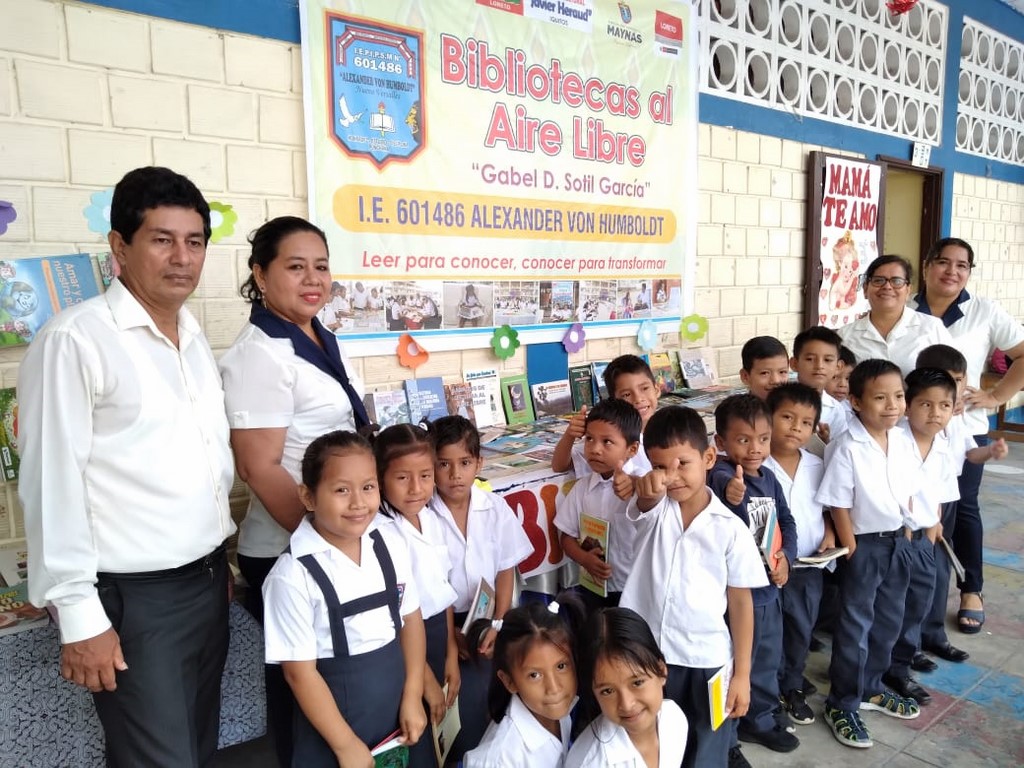 Esta biblioteca al aire libre está ubicada en una zona apropiada en el perímetro del patio del colegio ALEXANDER VON HUMBOLDT, donde 100 libros de autores Amazónicos Loretanos están a disposición de los alumnos durante todo el año y los docentes podrán desarrollar su plan lector articulado y programado, teniendo como herramientas pedagógicas los libros producidos por escritores de nuestra zona.