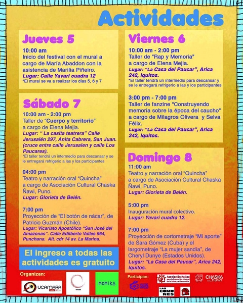 El 4, 5, 6, 7 y 8 de marzo del 2025, se va a realizar «Iquitas: Un festival hecho por mujeres en la Amazonía peruana». En la edición de este año, la organización Memira, en alianza con radio Ucamara y colectivo Tsiuni, ha elaborado una programación dedicada a ahondar en lo que significó la época del caucho y la repercusión que tuvo en las vidas de las mujeres.