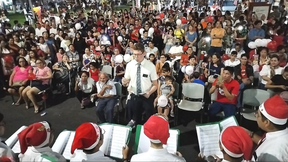 Los coros de las unidades de la Iglesia Iquitos y Punchana y de los misioneros de la Misión Iquitos de la Iglesia de Jesucristo entonaron varios himnos de alabanza y villancicos e invitaron a la concurrencia a unirse al coro cantando todos juntos mientras se encendían velas entre los concurrentes, la conocida melodía: “Noche de luz, noche de paz”.