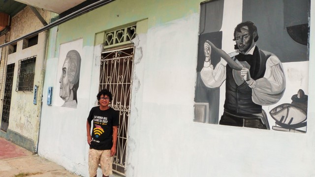 En esta oportunidad he plasmado el rostro de personajes que hicieron cosas en la época del caucho. Como el inventor del elástico, el que vulcanizó el caucho y sus derivados. A Julio C. Arana, con un fondo de indígenas, recordar también que fue un genocida como dice la historia. Benjamín Saldaña, el personaje que denunció todos esos abusos. Así como el presidente Juan Velasco Alvarado, que ayudó en los derechos de las comunidades indígenas de la Amazonía” expresa el joven.