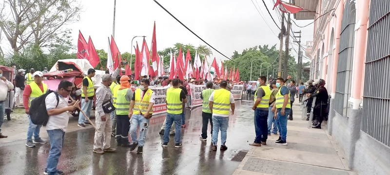 Al promediar las 8 de la mañana el miércoles 27 de julio, unos doscientos miembros de la CGTP portando banderas rojas y blancas llegaron hasta la sede de la Prefectura de Loreto, en la calle Malecón Tarapacá entre Morona y Sargento Lores, donde realizaron un plantón.