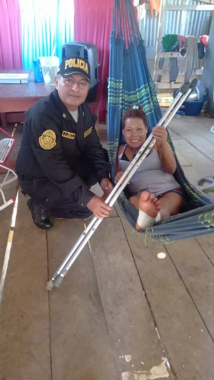 La citada mujer, producto del accidente de tránsito sufrió la fractura de “tibia” de la pierna izquierda, situación que le dificulta realizar sus labores diarias, motivo por el cual los promotores de la sección de policía comunitaria de la comisaria PNP Punchana, le hicieron la entrega en calidad de donación un par de muletas de aluminio, vendas, medicinales e insumos de primeros auxilios, siendo agradecido por la beneficiaria refiriendo que lo entregado mejorará su calidad de vida durante su periodo de recuperación médica. (C. Ampuero)