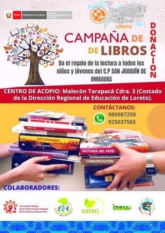 La Red Mundial de Jóvenes Políticos de Loreto, es una organización juvenil que tiene cómo fin promover espacios políticos, sociales, culturales y económicos en beneficio de nuestra sociedad, en ese afán han venido trabajando en distintas actividades, y en esta oportunidad vienen difundiendo la campaña “Embajadores de Libros” que consiste en convocar a la población en general a donar libros en buen estado, esto con el fin de implementar una biblioteca comunitaria en la Comunidad de San Joaquín de Omagua.