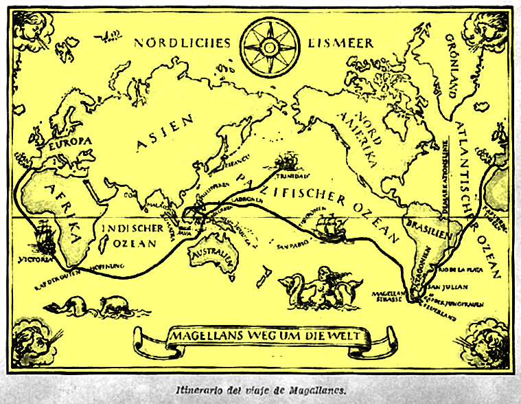 Con similar motivación de alcanzar la India y las Islas de las Especias, el 10 de agosto de 1519, el navegante portugués Fernao de Magalhais (Fernando de Magallanes), secundado por el español Sebastián Elcano –previa Capitulación (autorización) y financiación del rey Carlos V de España), acompañados de 260 tripulantes, emprendieron en 5 precarias embarcaciones, la más grande aventura humana que se conoce hasta hoy –comparto este parecer de Stefan Zweig- de ¡Dar la vuelta por primera vez la Tierra!, comprobándose su redondez, su volumen, su longitud, entre otras maravillas descubiertas.