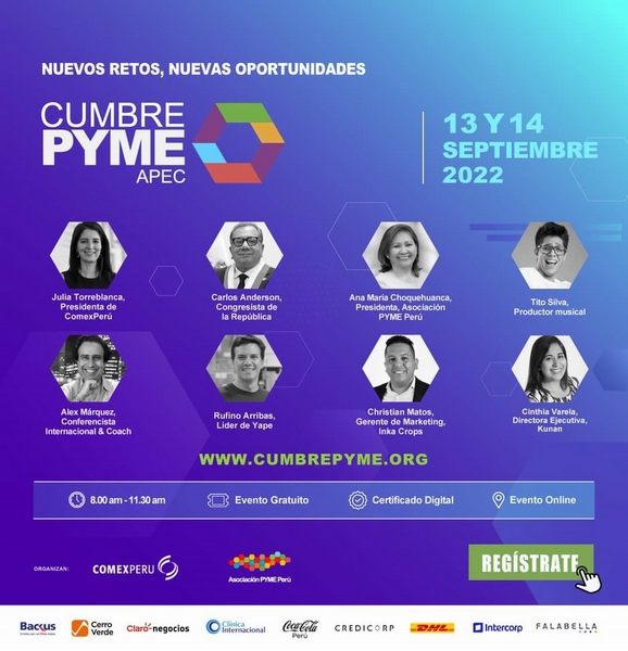 La XV Cumbre Pyme del APEC “Nuevos Retos, Nuevas Oportunidades” se desarrollará de manera virtual del 13 al 14 de setiembre, y tendrá como objetivo fortalecer las capacidades de las empresas, brindándoles herramientas innovadoras para mejorar su competitividad e impulsar el desarrollo de las políticas públicas que promuevan la formalización e internacionalización.