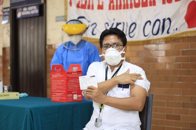 Por tanto, hasta EsSalud la tarde de ayer, también llegó la dotación de 446 vacunas para el personal de salud que está en la primera línea de atención. Finalmente, en el Hospital Iquitos “Cesar Garayar García” se realizó la vacunación del médico Infectólogo, Dr. Luis Runciman; cabe precisar que para este nosocomio se consideró 418 dosis de vacuna de la Covid-19 y continuarán vacunando en las próximas horas.