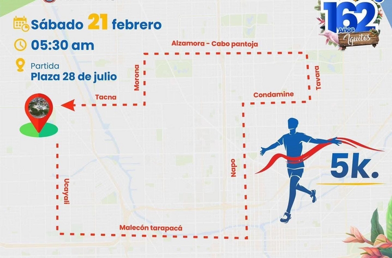 En el marco del 162 Aniversario de la Conmemoración del Establecimiento del Puerto Fluvial de la Ciudad de Iquitos sobre el Río Amazonas, organizado por la Municipalidad Provincial de Maynas, se realizan diversas actividades, entre ellas mañana sábado 21 de febrero del 2026, es la oportunidad en las Rutas de las Carreras 5k y 10k, partiendo desde la plaza 28 de Julio a las 5:30 am. Será una experiencia llena de energía.