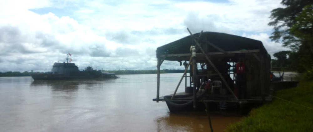 Durante la realización de la Jornada de Acción Cívica Binacional Perú-Colombia en el río Putumayo, el B.A.P. «CLAVERO», unidad perteneciente a la Comandancia General de Operaciones de la Amazonía y Quinta Zona Naval – Marina de Guerra del Perú, detectó 3 embarcaciones tipo draga efectuando labores de dragado en el alto Putumayo, las mismas que fueron intervenidas por personal Guardacostas del Distrito de Capitanías 5, representante de la Autoridad Marítima en la Amazonía y personal de la División de Turismo y Medio Ambiente de la Policía Nacional del Perú con sede en Iquitos embarcados, con el apoyo de las lanchas de la unidad naval y personal de seguridad.