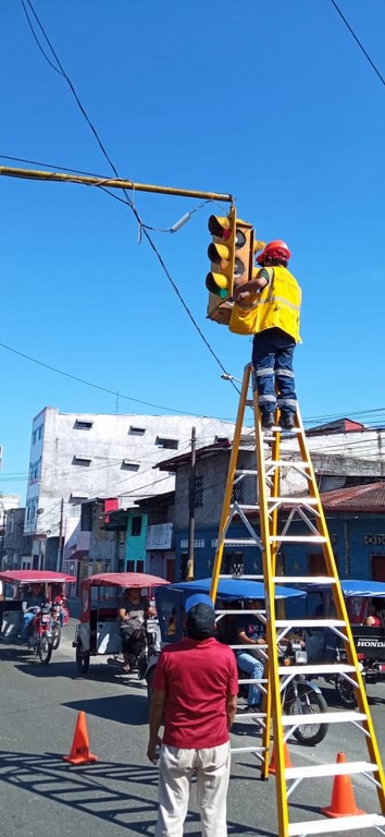 Personal de la sección de Señalización y Semaforización, pertenecientes a la Gerencia de Tránsito y Transporte Público de la Municipalidad Provincial de Maynas, continúa con los trabajos de reparación de los semáforos en diferentes puntos de la ciudad, con el objetivo de prevenir accidentes de tránsito y evitar malestar en los conductores y transeúntes.
