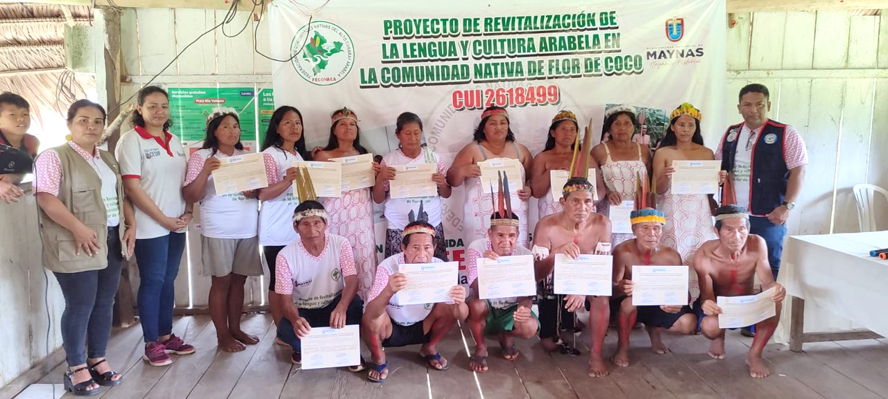 Este proyecto, cuyo objetivo principal es la revitalización de la lengua y el fortalecimiento de la cultura Arabela, contó con la participación de más de 60 representantes de las comunidades de Flor de coco, Buena Vista, Urbina y Shapajal; asimismo, se desarrolló bajo el acompañamiento técnico de la Dirección General de Educación Intercultural Bilingüe – DIGEIBIRA del Ministerio de Educación, así como con el acompañamiento de un especialista de Educación Intercultural Bilingüe de la UGEL Maynas.