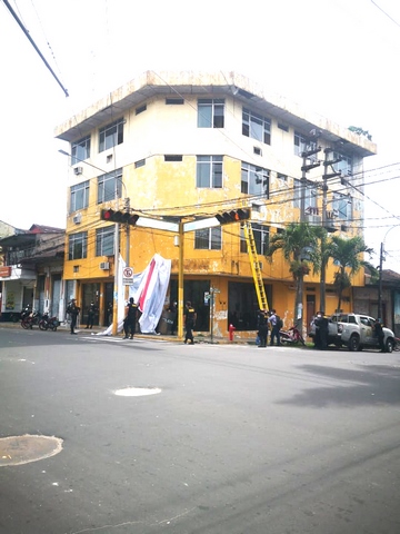 La gerencia de Acondicionamiento Territorial de Municipalidad Provincial de Maynas en eficiente y eficaz trabajo con Serenazgo de Maynas, la Policia Nacional del Perú y Dirección Desconcentrada de Cultura retiraron una enorme banderola colocada en un edificio ubicado en la esquina de las calles Fitzcarrald con Napo, en la Plaza de Armas – zona monumental.