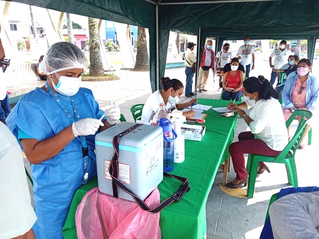 La municipalidad provincial de Maynas a través de la División de Participación Comunitaria adscrita a la gerencia de Desarrollo Social en trabajo articulado con la Micro Red Iquitos Norte-IPRESS Moronacocha – DIRESA Loreto vienen realizando la vacunación de la tercera dosis contra la covid_19, dirigido al personal de las diferentes áreas de la Comuna de Maynas en la Plaza Sargento Lores, con la finalidad de reducir los índices de contagio del covid-19 ante la llegada de la tercera ola.
