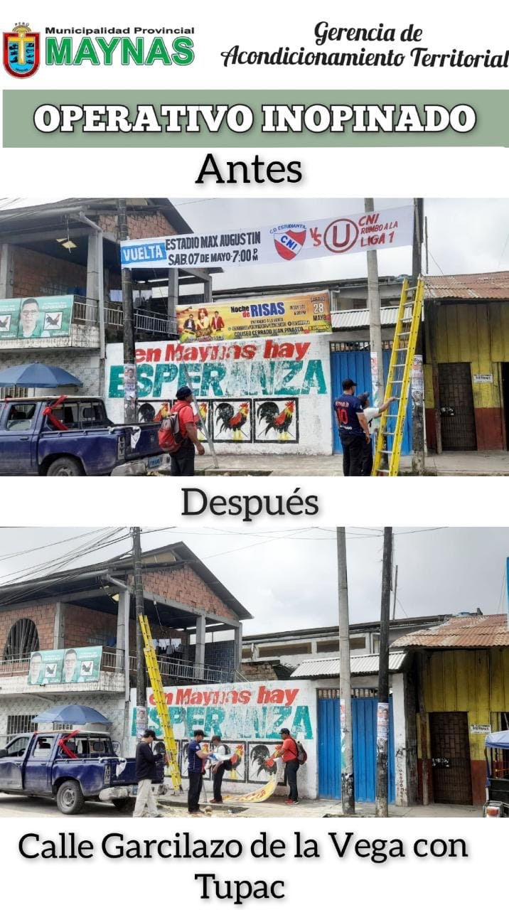 La Municipalidad Provincial de Maynas, en cumplimiento de la Ordenanza 011-2020-A-MPM y la Ley 29090- La Gerencia de Acondicionamiento Territorial comandado por el personal de la Sección de Control Urbano, junto a Servicios Generales, realizaron un Operativo Inopinado en la Recuperación de la vía pública por toda la jurisdicción del distrito de Iquitos.