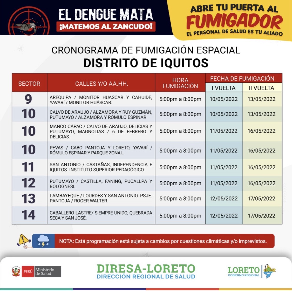 De acuerdo al cronograma de la DIRESA, la fumigación espacial para el distrito de Iquitos se inicia este jueves 12 de mayo en los sectores indicado en el cuadro adjunto.