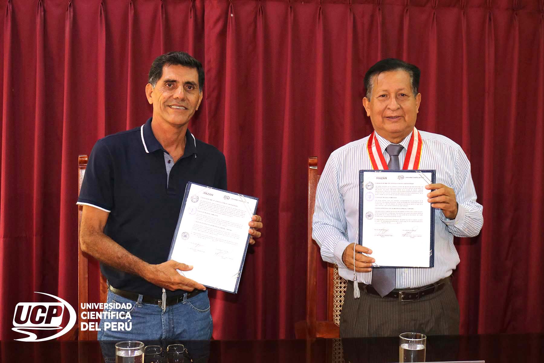 Promoviendo espacios que permitan concertar acciones de desarrollo educativo, cultural y socioeconómico, la Universidad Científica del Perú-UCP, que preside el Dr. Juan Remigio Saldaña Rojas, y la Municipalidad Distrital de Mazán, debidamente representada por el profesor, Víctor Hugo Lozano Calampa, firmaron un importante Convenio Marco de Cooperación Interinstitucional, el cual tiene como misión fortalecer el desarrollo académico de los jóvenes del distrito.