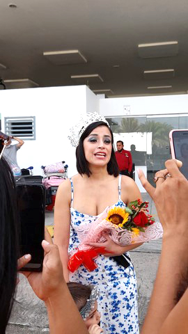 Mostrando su cetro, corona ganada internacionalmente, dedicó estas palabras “Muy pero muy agradecida por el recibimiento en mi tierra natal..me encuentro feliz..feliz de sentir la calidez de la gente y el clima de mi Iquitos querido.