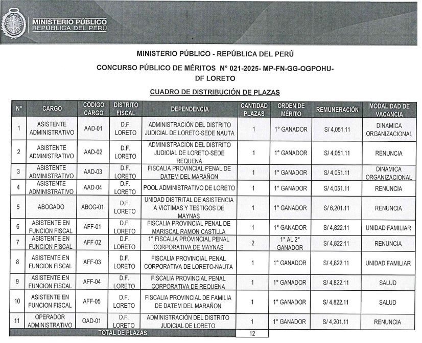 El Ministerio Público – Distrito Fiscal de Loreto invita a la ciudadanía a participar en el Concurso Público de Méritos N.° 21-2025, que ofrece 12 plazas en diversas sedes y dependencias de la región, bajo el régimen laboral del DL 728 (plazo indeterminado).