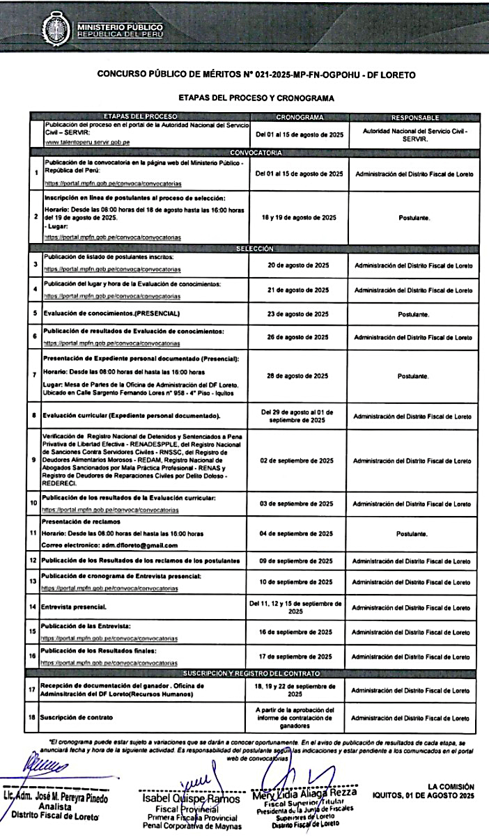 Ministerio Público invita a participar en concurso público de méritos N.° 21-2025 en el Distrito Fiscal de Loreto