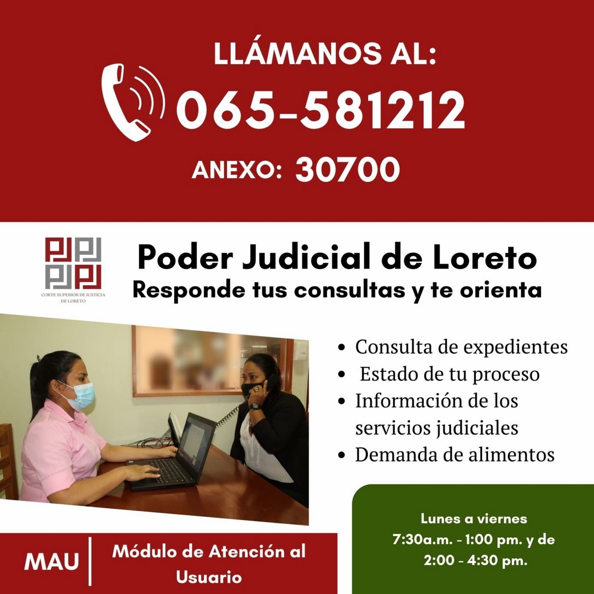La Corte Superior de Justicia de Loreto implementó dentro de las instalaciones de la sede central el Módulo de Atención al Usuario (MAU), servicio gratuito que absuelve las consultas o dudas del público en general, respecto a su proceso judicial, así como información de todos los servicios del Poder Judicial.