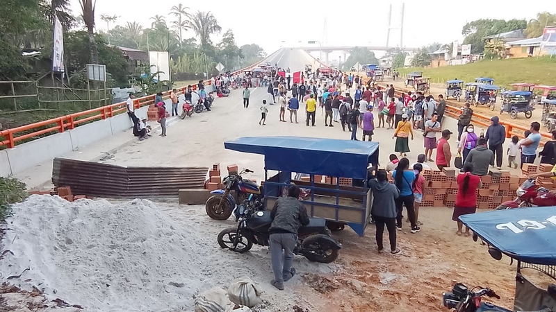 “Nos quitan nuestras tierras” “Marina de Guerra traiciona a santo tomas” “los niños y niñas nos quedamos sin escuela”, son algunos de los carteles que los pobladores alzaron el día de ayer en la entrada al puente que llega hasta la ciudad de Iquitos.