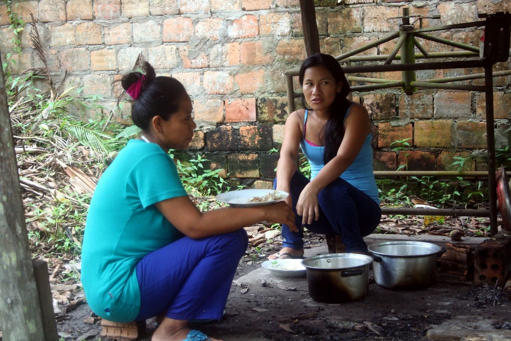 Ayer se pudo encontrar a dos jóvenes estudiantes indígenas bajo una maloca, comiendo pango en olla común. Ambas contaron que vienen estudiando en Iquitos, que no es fácil pero que continúan adelante hasta contar con una carrera que luego les permita ayudar a sus familias que han quedado en el Putumayo.