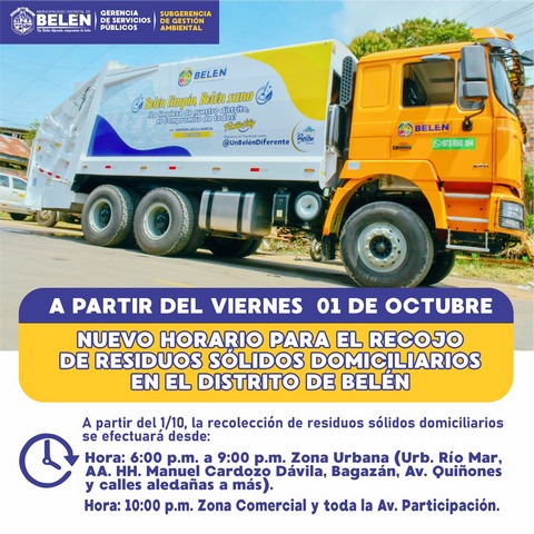 Por disposición del Alcalde Gerson Lecca García de formular un plan de acción que mejore el trabajo de recolección de residuos sólidos en todo el distrito, la Sub Gerencia de Gestión Ambiental de la Municipalidad Distrital de Belén implementará desde la primera semana del mes de octubre, un nuevo y mejor horario de recojo de residuos sólidos que consistirá en: de las 6 p.m. a 9 p.m. zona urbana (Río Mar, Cardozo, Bagazán, Av. Quiñonez y zonas aledañas, adicionalmente desde las 10 p.m. a más zonas comerciales y toda la Av. Participación.