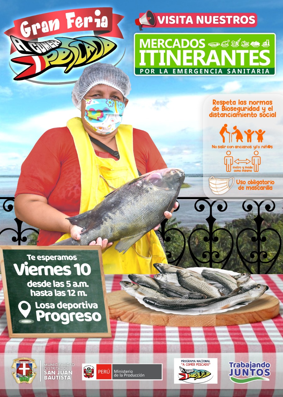 Preocupado por la seguridad alimentaria de la población, el alcalde de la Municipalidad Distrital de San Juan Bautista, Ángel López, tras una fructífera reunión realizada días anteriores, en los ambientes del CITE Maynas, con los productores acuícolas del distrito, llegó a un importante acuerdo de iniciar desde hoy, la feria “A comer pescado” a fin de beneficiar a los productores y consumidores, con la venta de esta carne con alto valor alimenticio y a un precio accesible.
