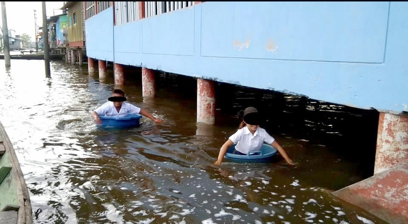 Algunos menores utilizan botes de madera, sin embargo otros utilizan bandejas de plástico para poder navegar por el río e ir hasta su centro de estudio.